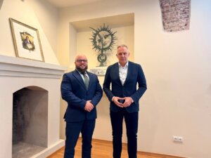 On April 23, 2026, the Rector of the European Humanities University (EHU), Dr. Vilius Šadauskas, met with the President of the Lithuanian Chambers of Commerce, Industry and Crafts, Sigitas Gailiūnas. During the meeting, the parties discussed strategic directions and opportunities for cooperation, with a focus on facilitating EHU students’ integration into the Lithuanian labour market.